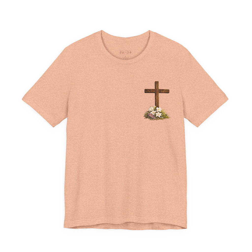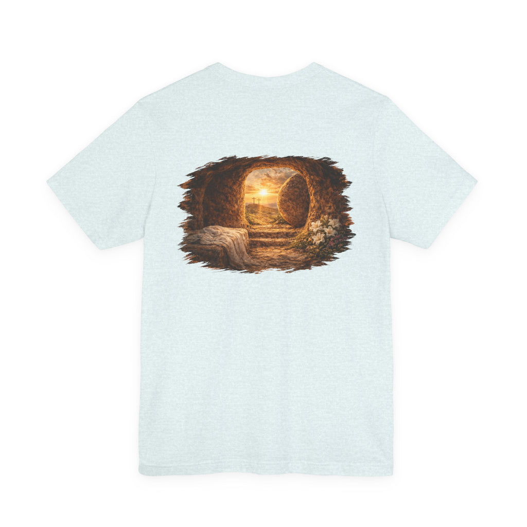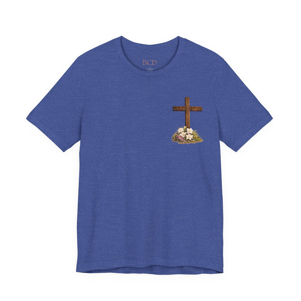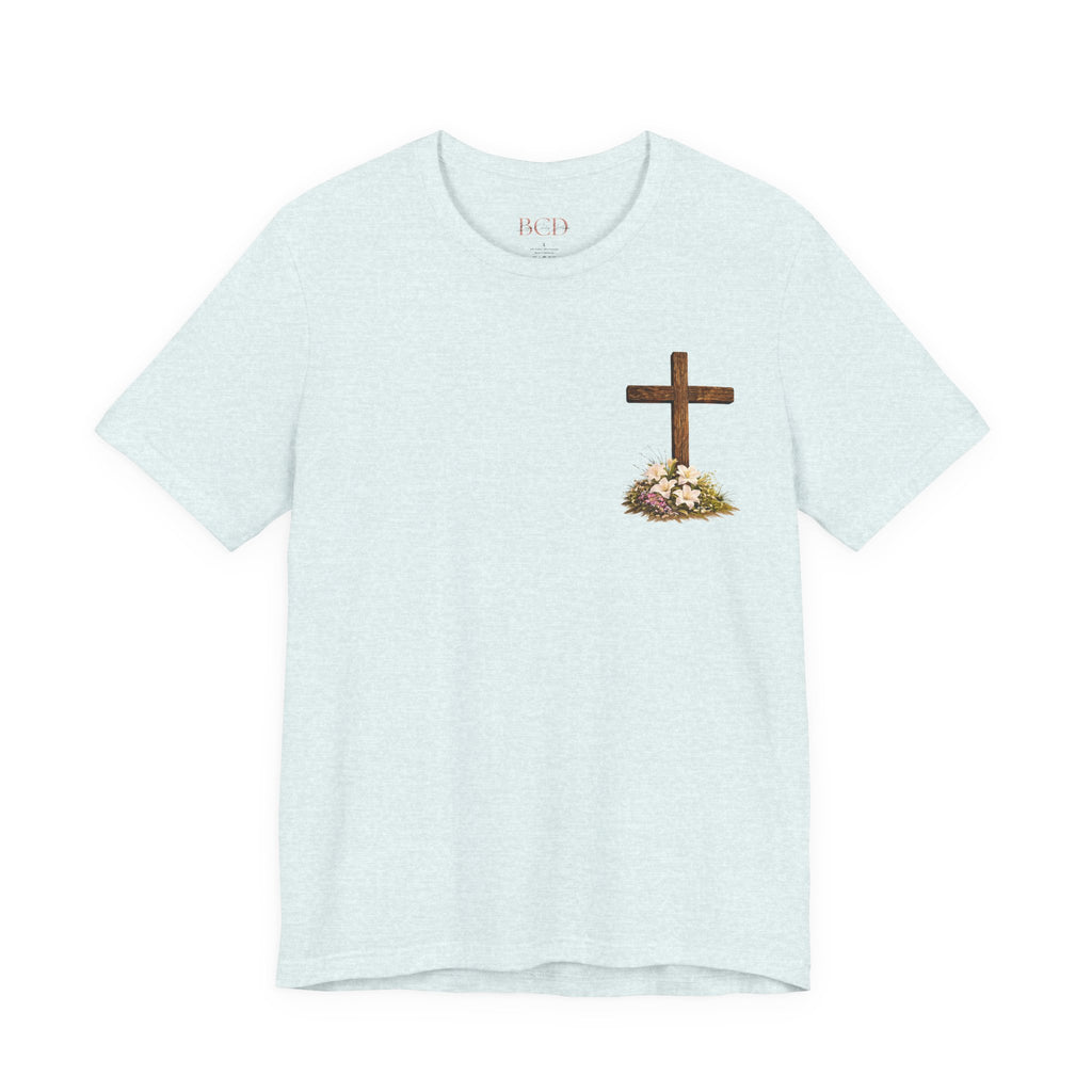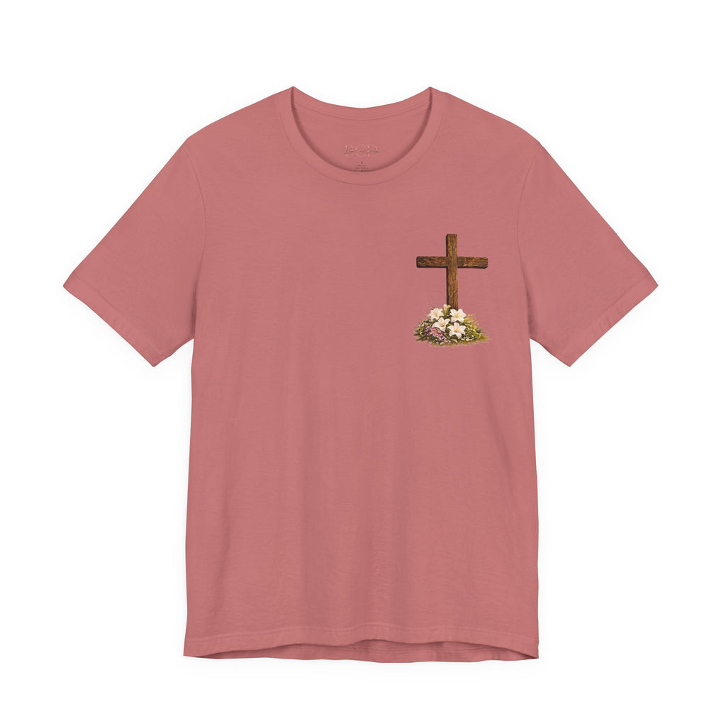 Soft, breathable tee that carries a quiet, hopeful message. On the chest, a simple wooden cross rests above a small bouquet — a subtle sign of faith you can wear every day. The back unfolds into a warm scene: an open tomb with morning light spilling out, rendered in painterly tones that feel like sunrise after a long night. Lightweight Airlume cotton and a retail cut keep the shirt comfortable for layering or standing alone. Wear it to church, volunteer days, sunrise services, or to hold a calm presence during personal reflection.