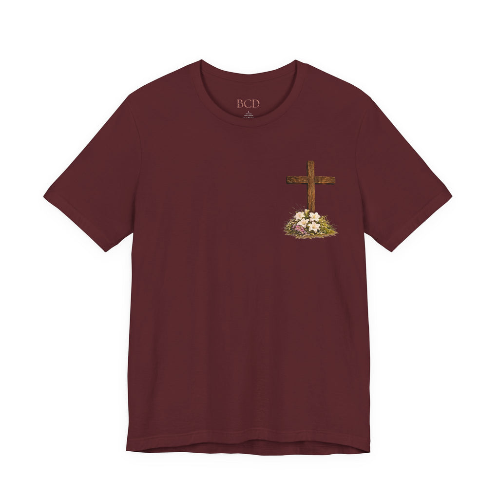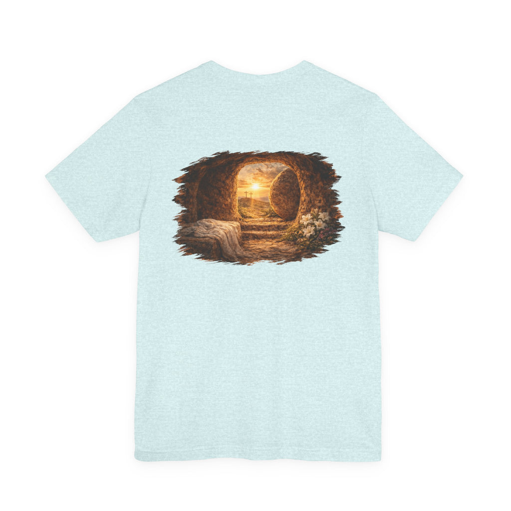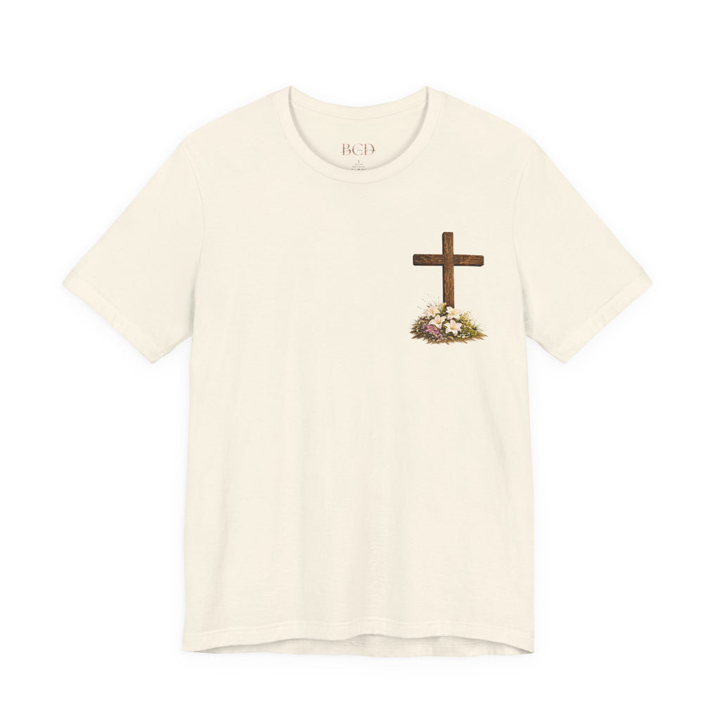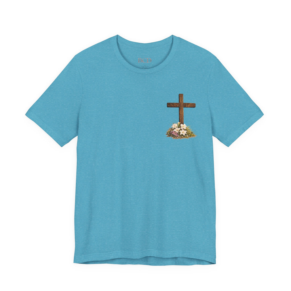 Soft, breathable tee that carries a quiet, hopeful message. On the chest, a simple wooden cross rests above a small bouquet — a subtle sign of faith you can wear every day. The back unfolds into a warm scene: an open tomb with morning light spilling out, rendered in painterly tones that feel like sunrise after a long night. Lightweight Airlume cotton and a retail cut keep the shirt comfortable for layering or standing alone. Wear it to church, volunteer days, sunrise services, or to hold a calm presence during personal reflection.