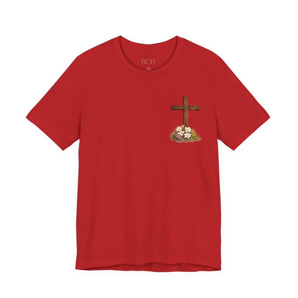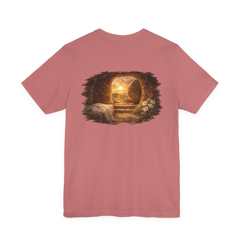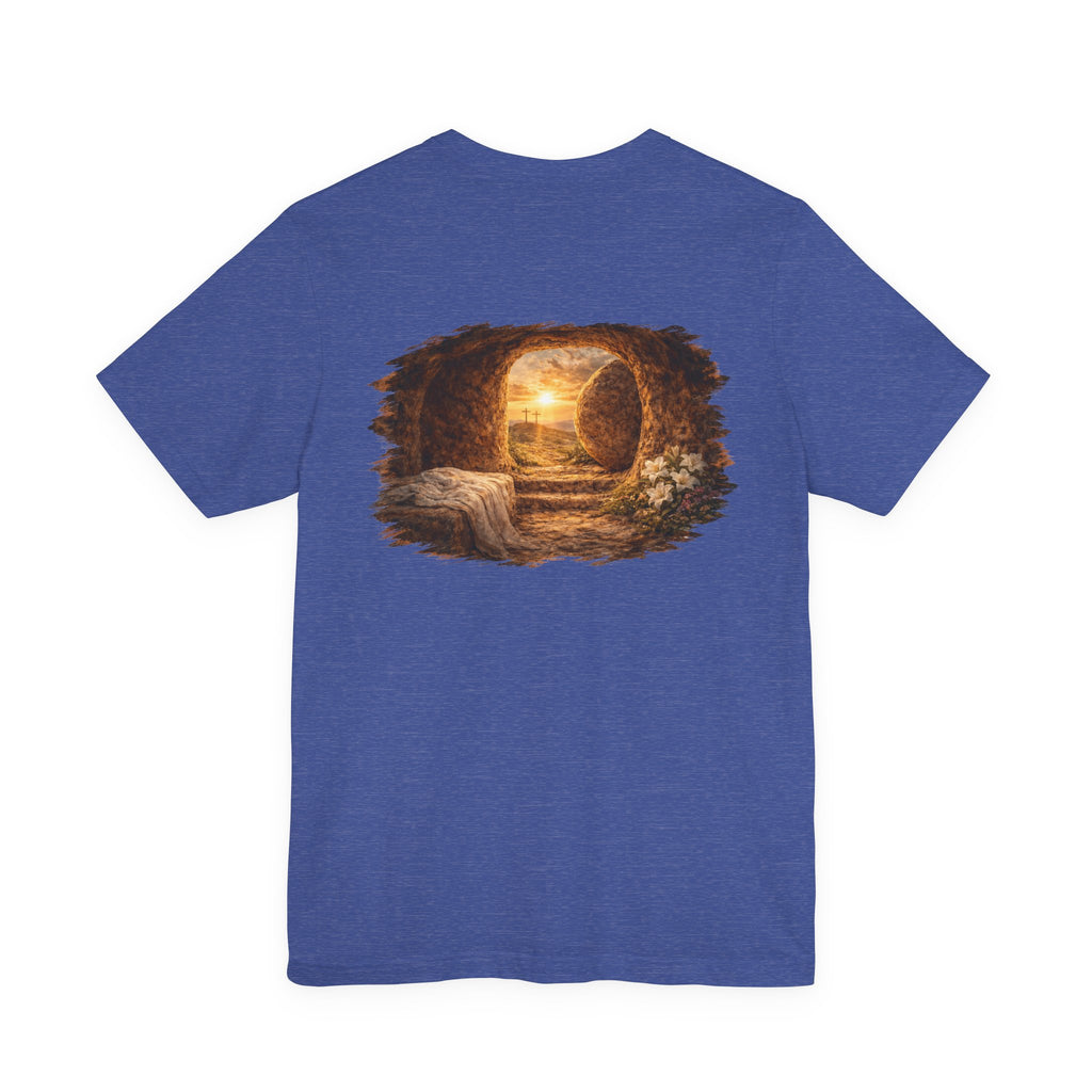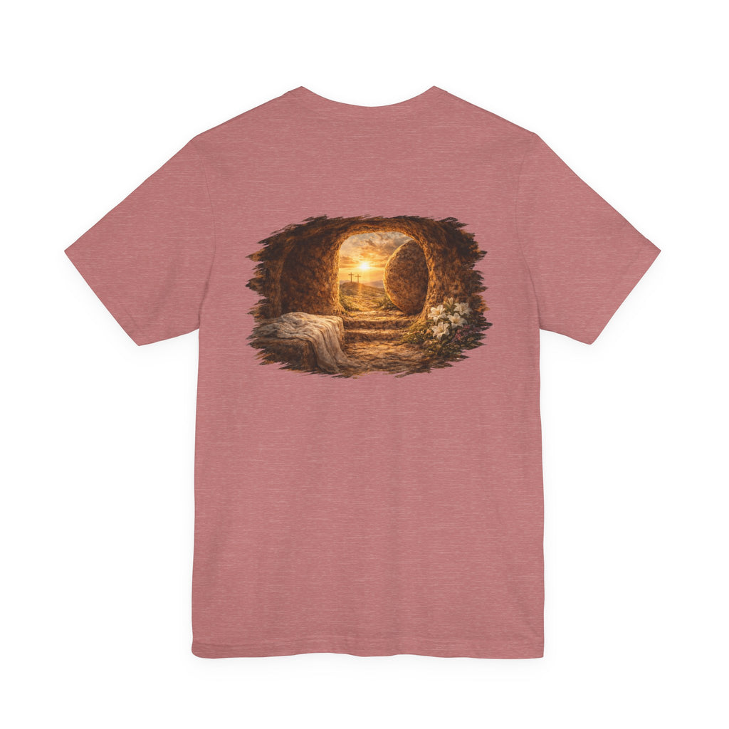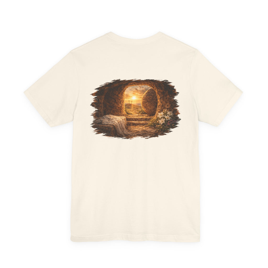 Soft, breathable tee that carries a quiet, hopeful message. On the chest, a simple wooden cross rests above a small bouquet — a subtle sign of faith you can wear every day. The back unfolds into a warm scene: an open tomb with morning light spilling out, rendered in painterly tones that feel like sunrise after a long night. Lightweight Airlume cotton and a retail cut keep the shirt comfortable for layering or standing alone. Wear it to church, volunteer days, sunrise services, or to hold a calm presence during personal reflection.