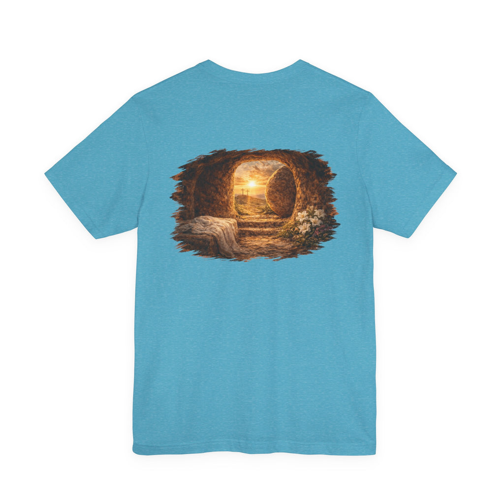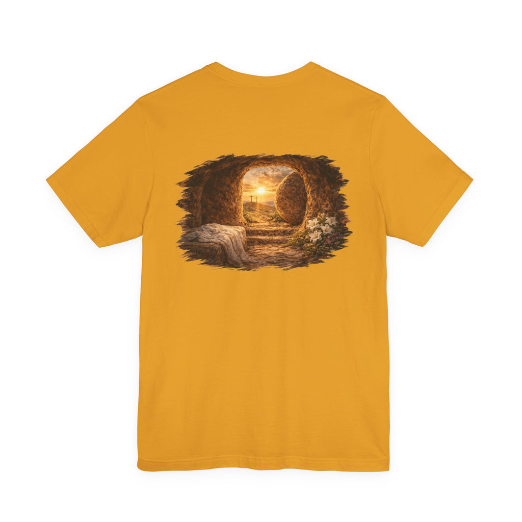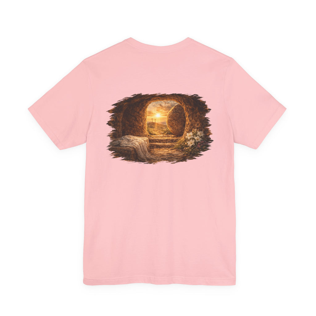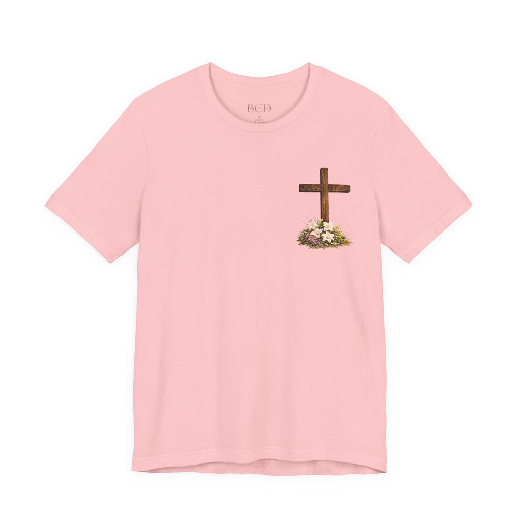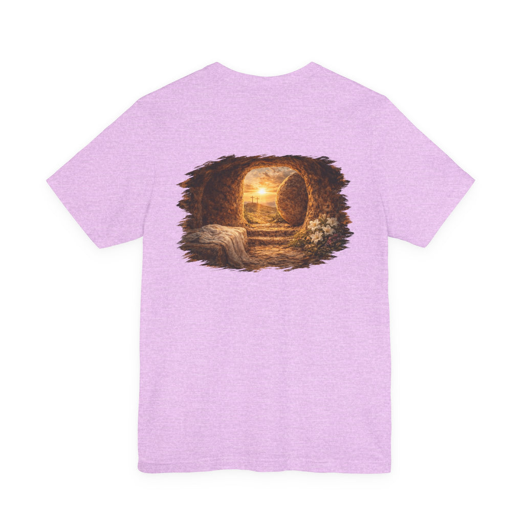 Soft, breathable tee that carries a quiet, hopeful message. On the chest, a simple wooden cross rests above a small bouquet — a subtle sign of faith you can wear every day. The back unfolds into a warm scene: an open tomb with morning light spilling out, rendered in painterly tones that feel like sunrise after a long night. Lightweight Airlume cotton and a retail cut keep the shirt comfortable for layering or standing alone. Wear it to church, volunteer days, sunrise services, or to hold a calm presence during personal reflection.
