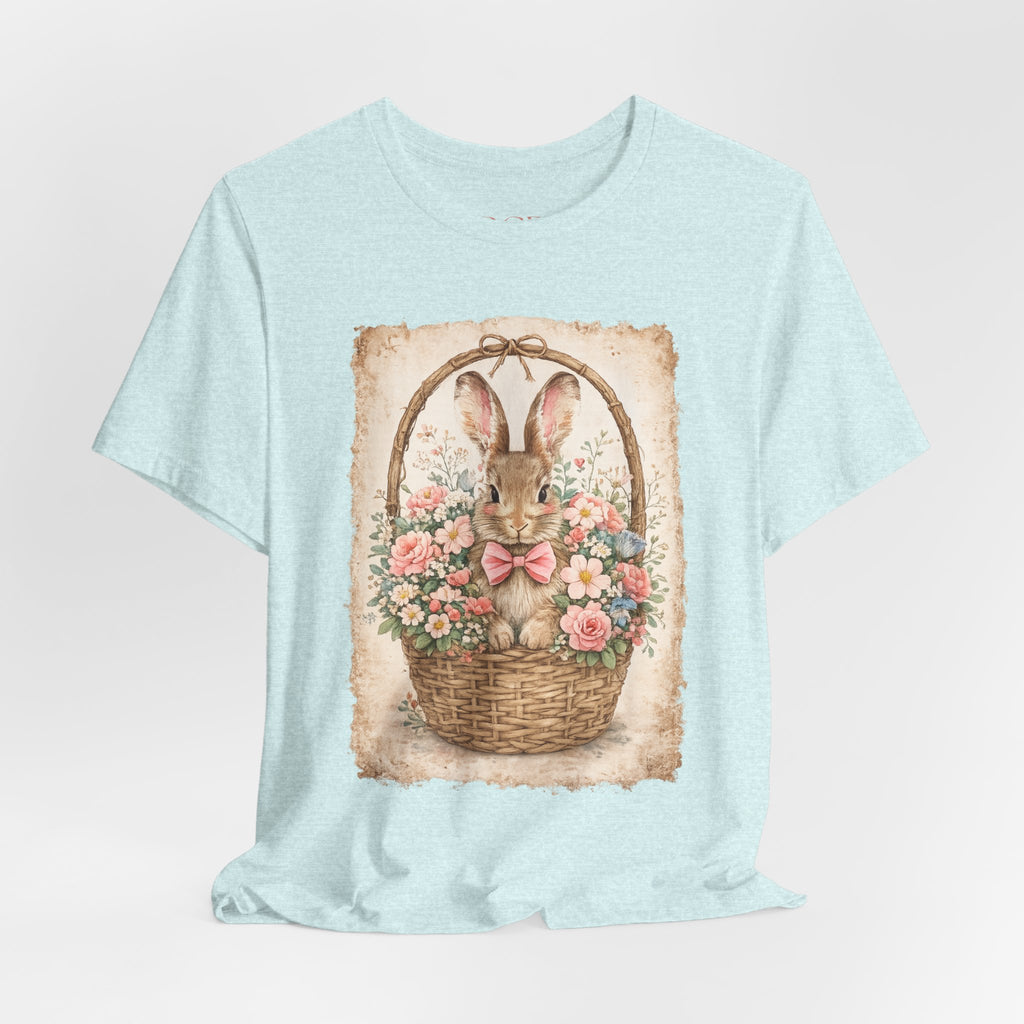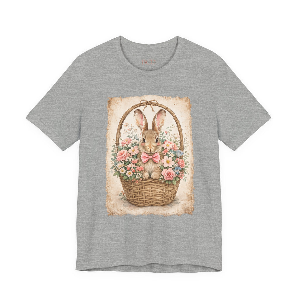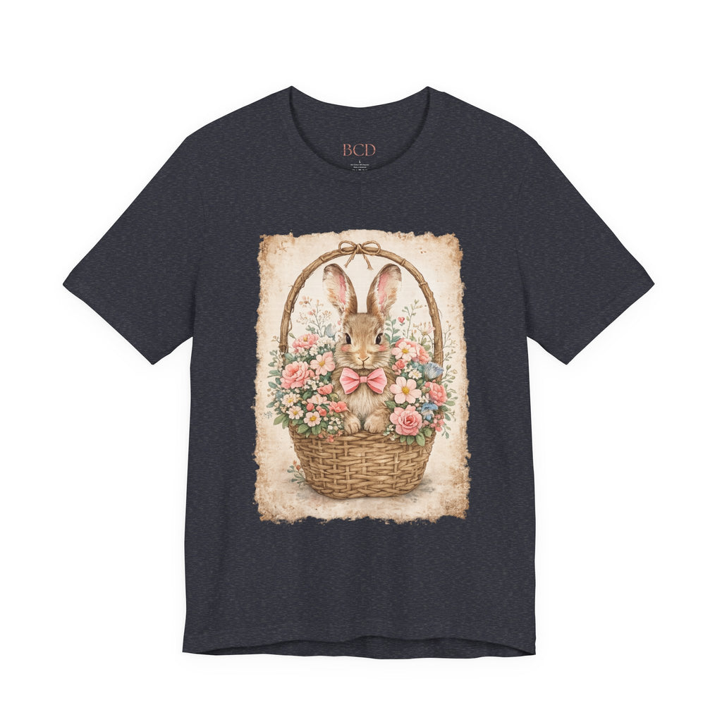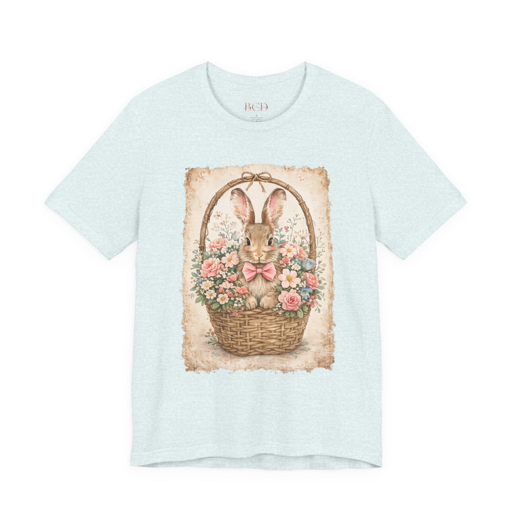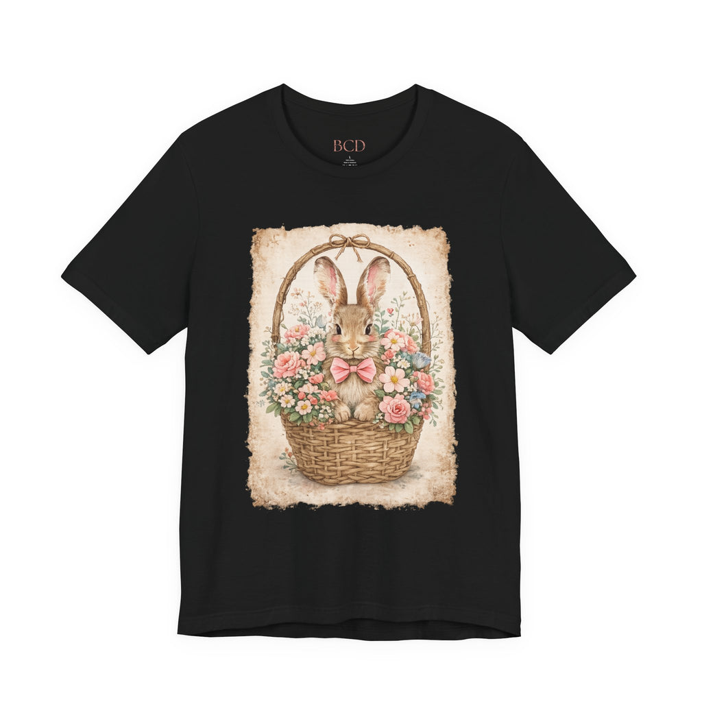 Soft, vintage charm meets everyday comfort in this lightweight jersey tee. A watercolor-style bunny peeks from a woven basket of blushing roses, framed by a softly aged border — it feels like a handwritten note from spring. The breathable Airlume combed cotton keeps you cool while the retail crew neckline and side seams hold a neat, relaxed silhouette that layers easily under jackets or stands on its own. Wear it for slow mornings with coffee, picnics in a flowered meadow, or gentle holiday gatherings where small, handmade details matter. The printed design keeps a delicate, storybook quality that will age gracefully with wear.