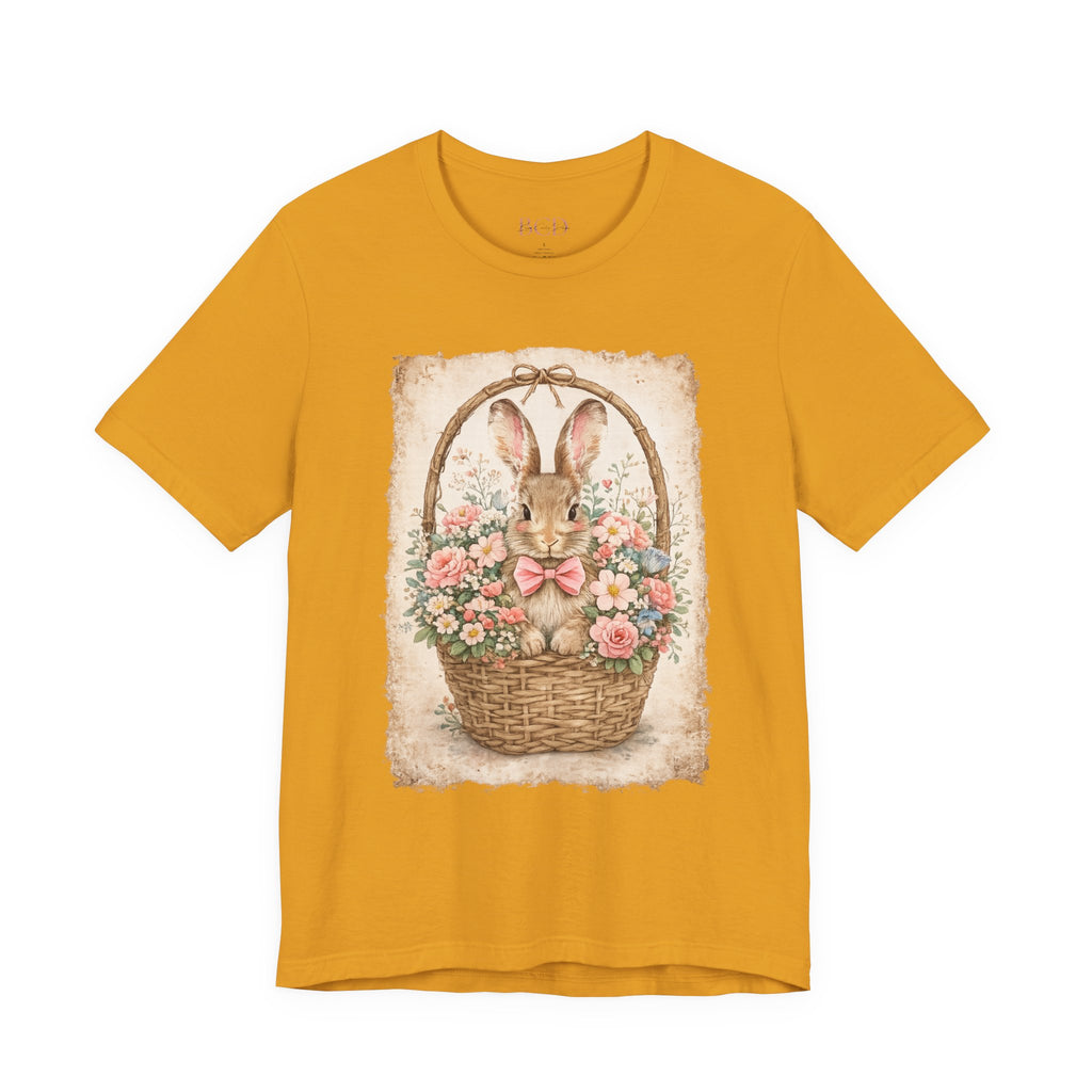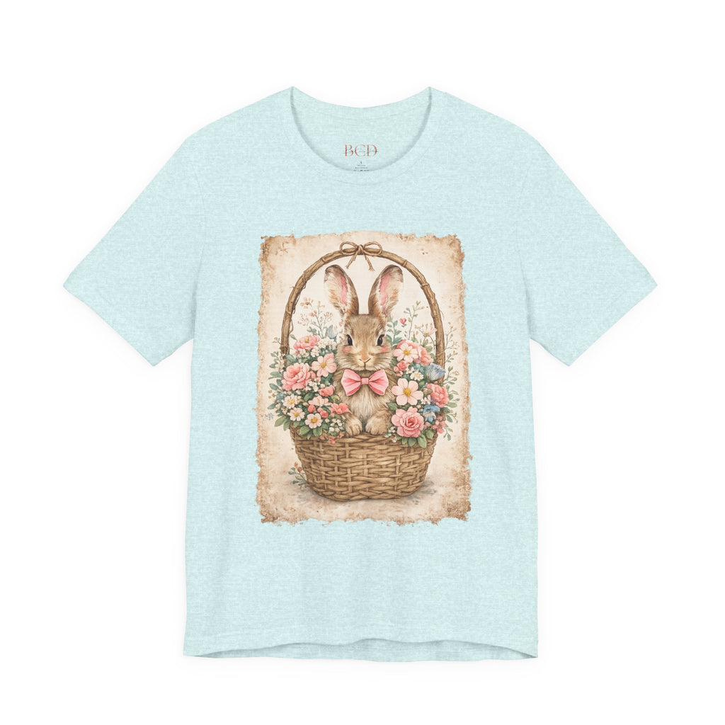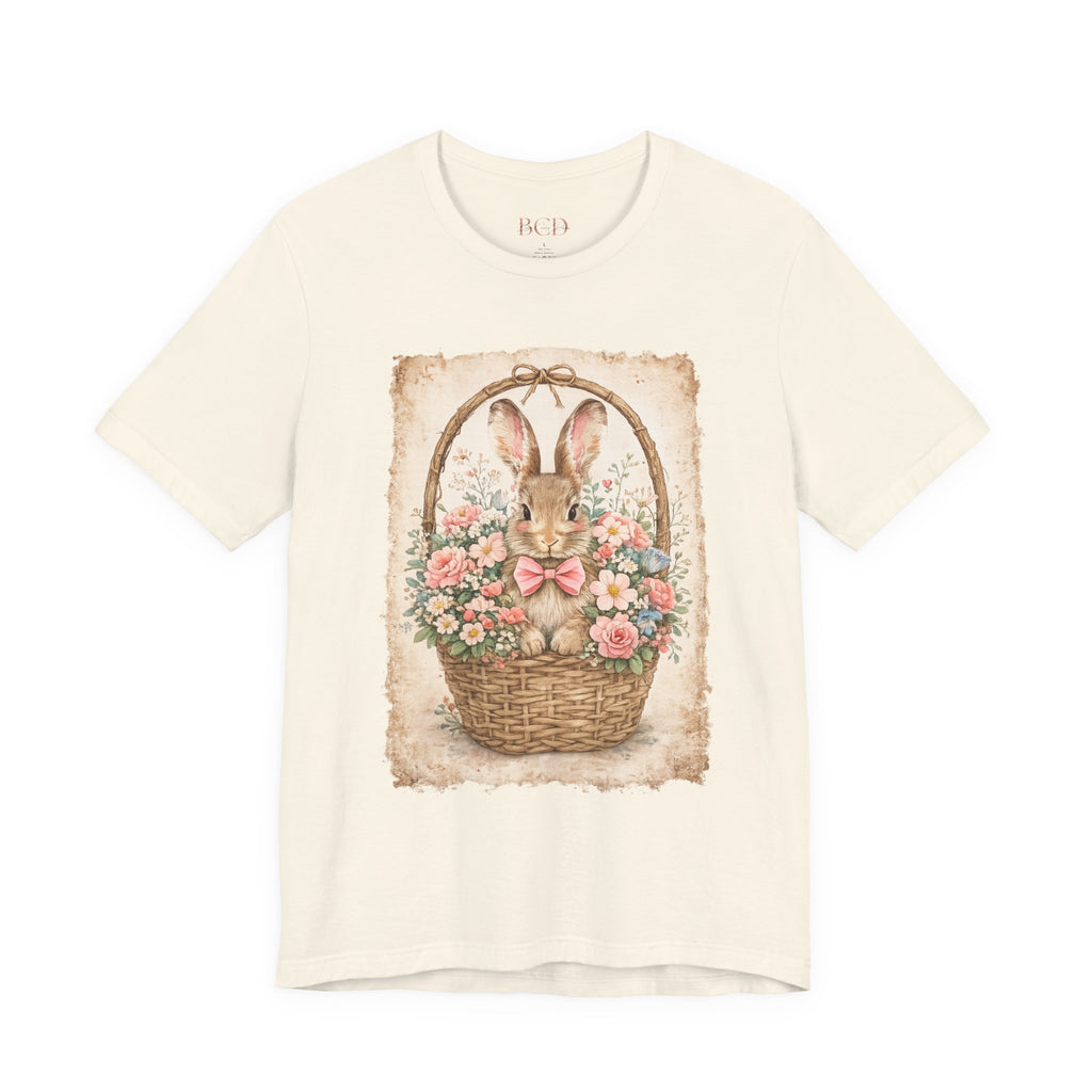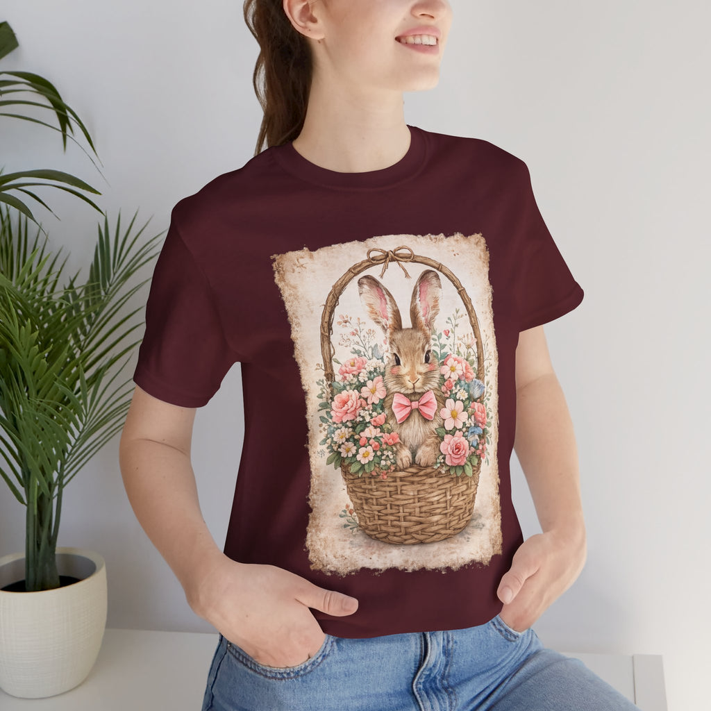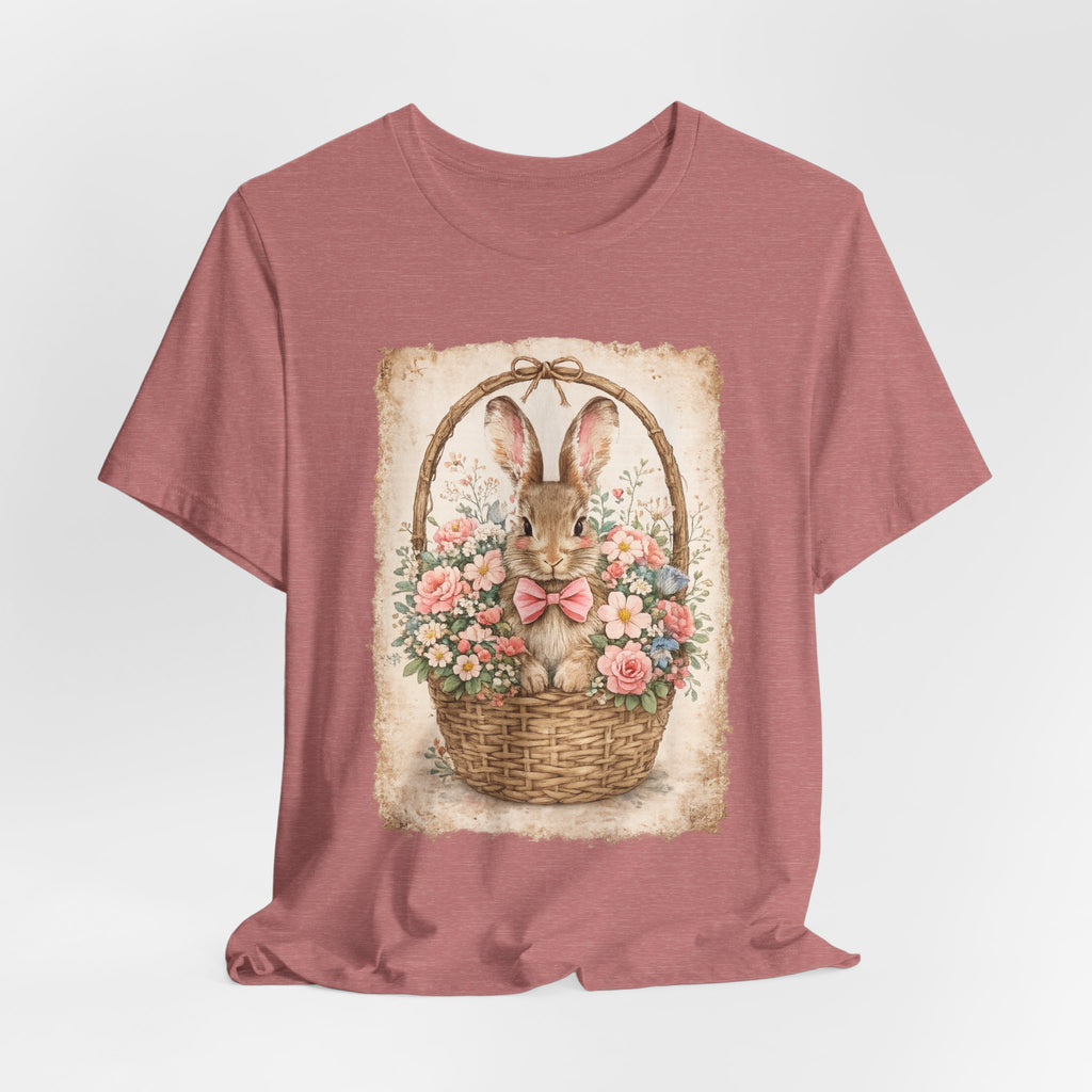 Soft, vintage charm meets everyday comfort in this lightweight jersey tee. A watercolor-style bunny peeks from a woven basket of blushing roses, framed by a softly aged border — it feels like a handwritten note from spring. The breathable Airlume combed cotton keeps you cool while the retail crew neckline and side seams hold a neat, relaxed silhouette that layers easily under jackets or stands on its own. Wear it for slow mornings with coffee, picnics in a flowered meadow, or gentle holiday gatherings where small, handmade details matter. The printed design keeps a delicate, storybook quality that will age gracefully with wear.