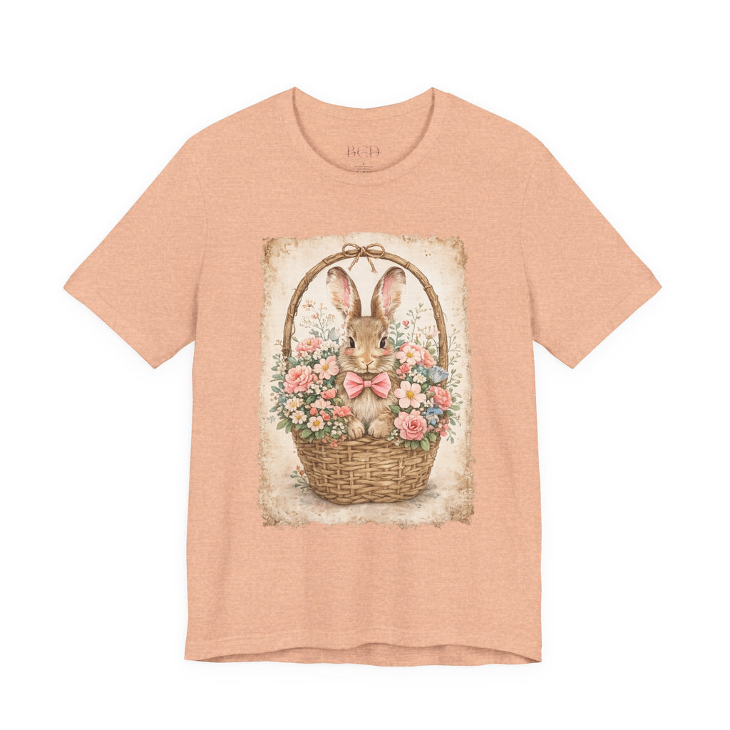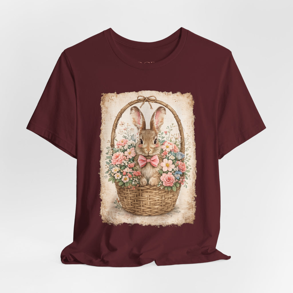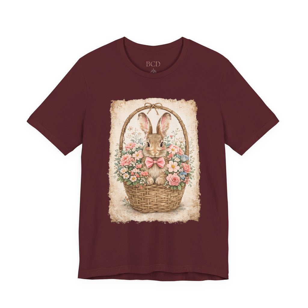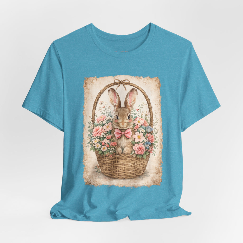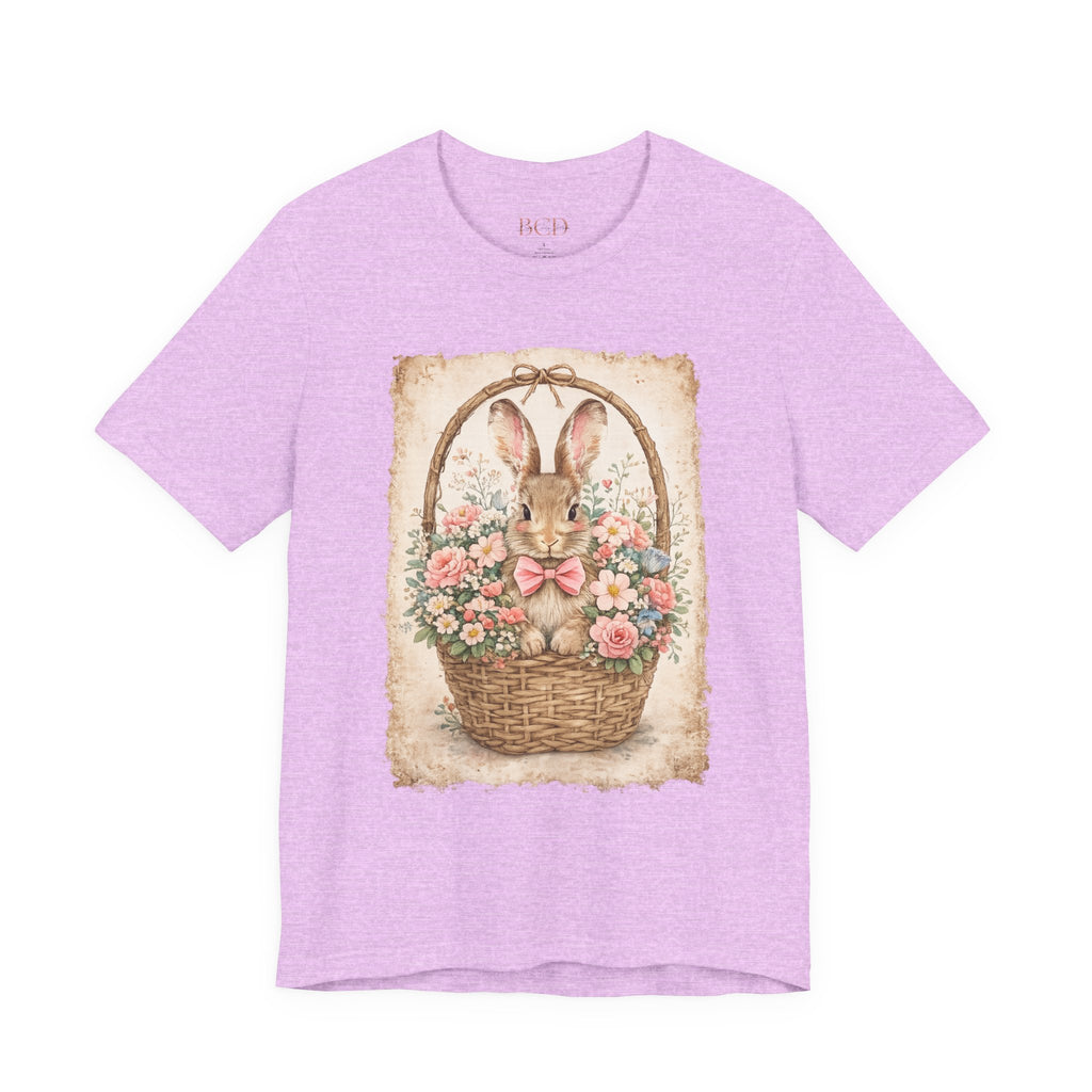 Soft, vintage charm meets everyday comfort in this lightweight jersey tee. A watercolor-style bunny peeks from a woven basket of blushing roses, framed by a softly aged border — it feels like a handwritten note from spring. The breathable Airlume combed cotton keeps you cool while the retail crew neckline and side seams hold a neat, relaxed silhouette that layers easily under jackets or stands on its own. Wear it for slow mornings with coffee, picnics in a flowered meadow, or gentle holiday gatherings where small, handmade details matter. The printed design keeps a delicate, storybook quality that will age gracefully with wear.