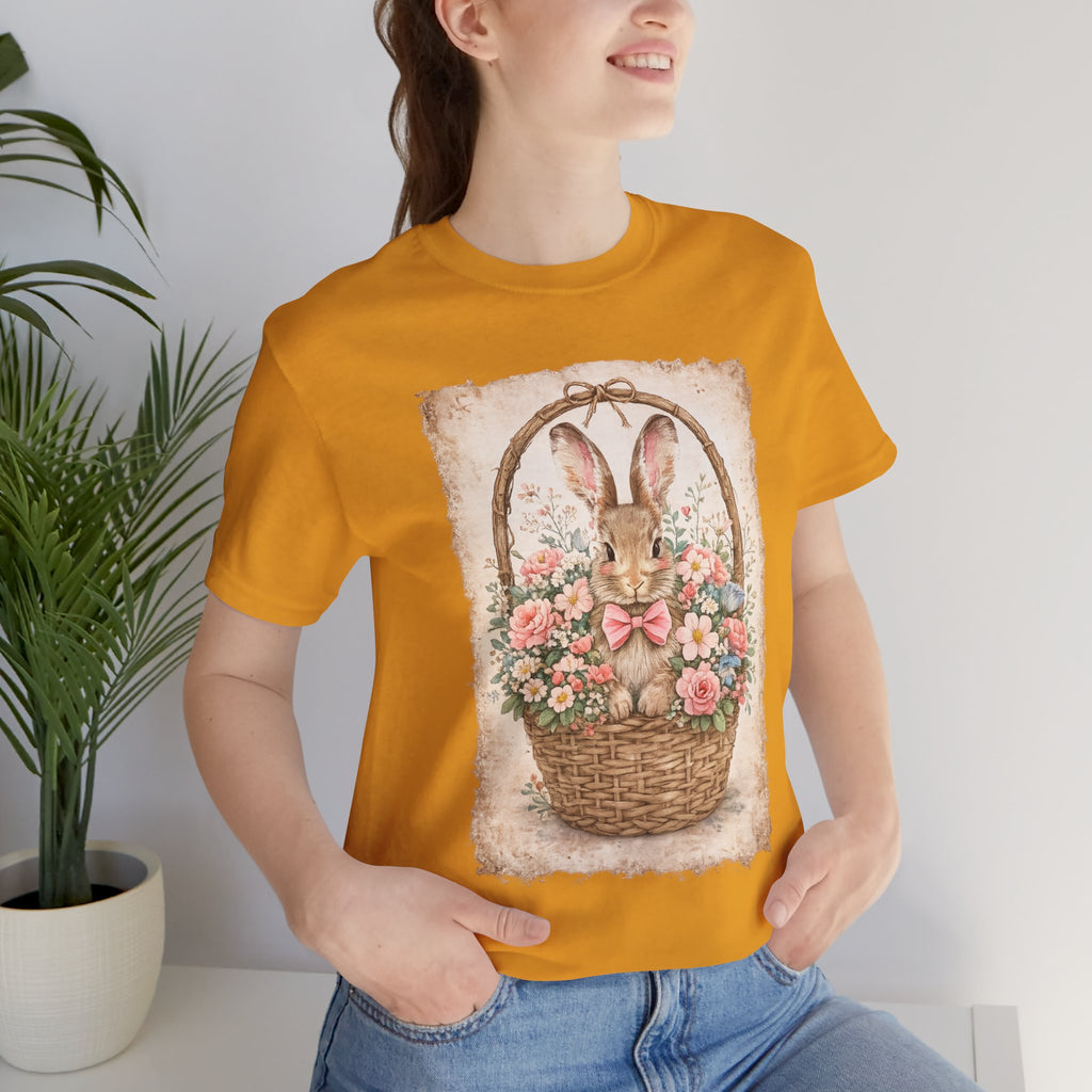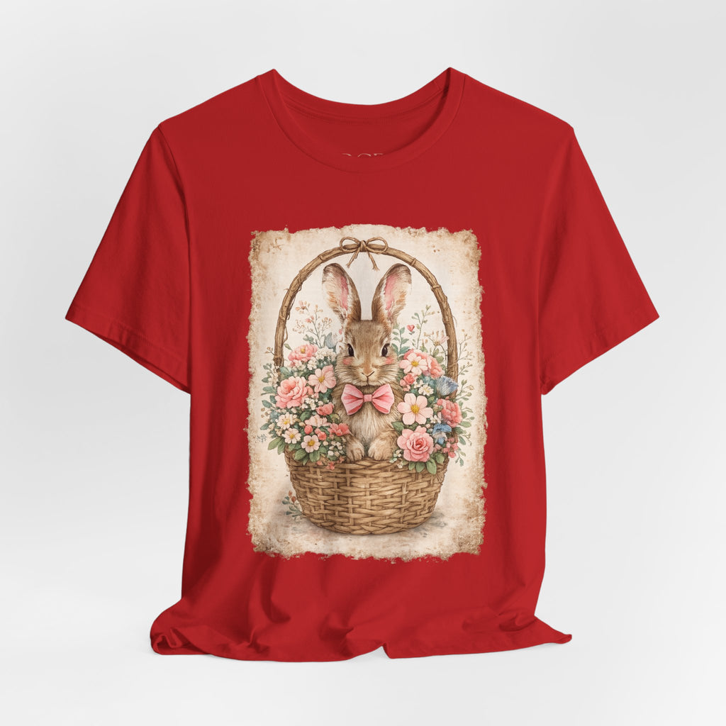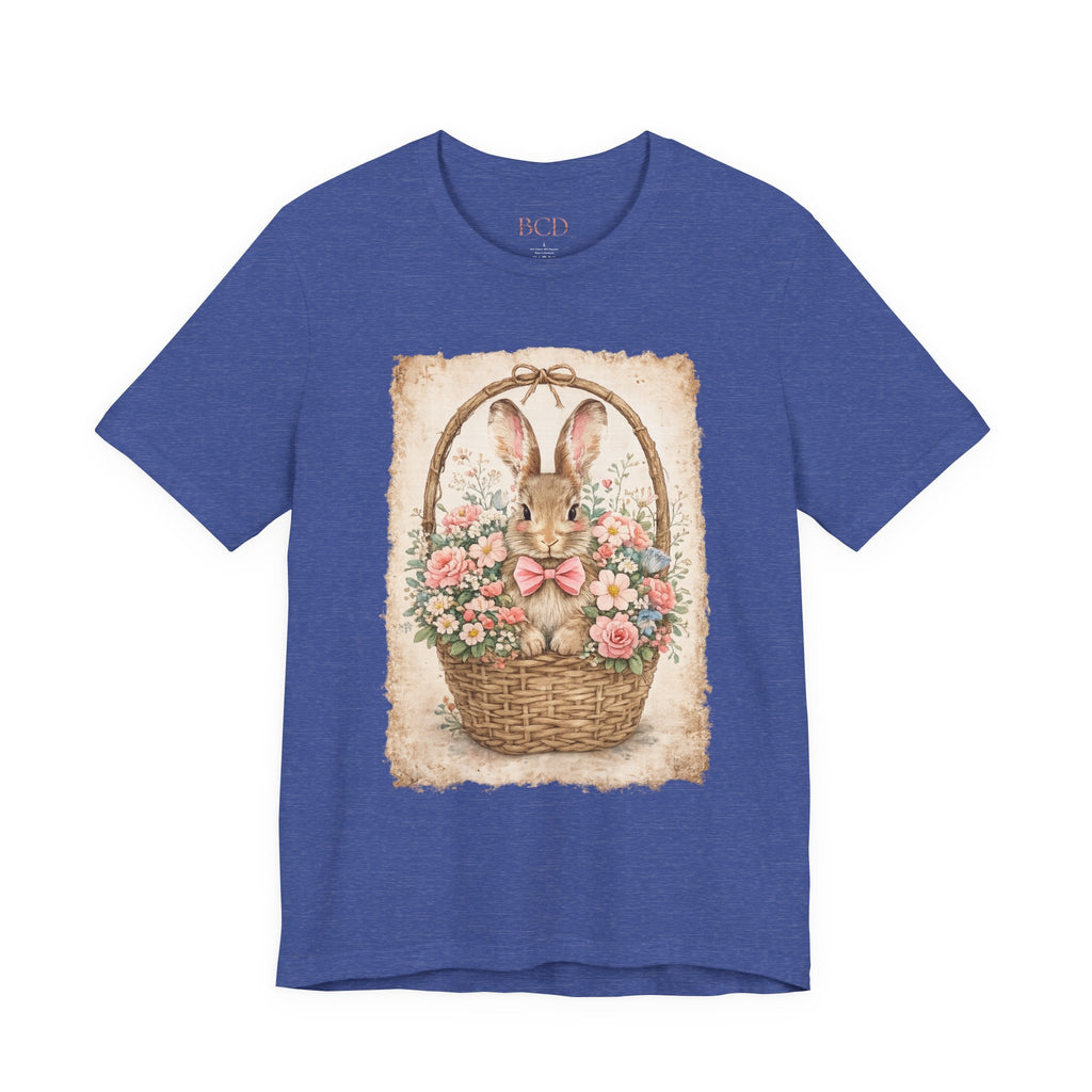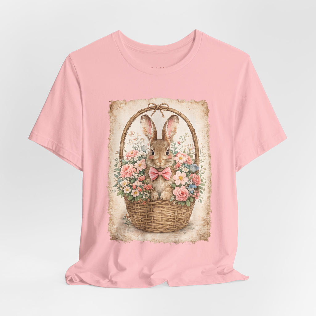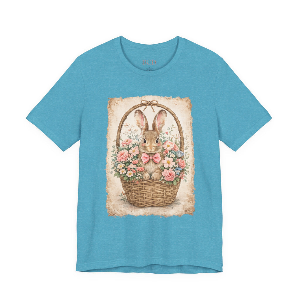 Soft, vintage charm meets everyday comfort in this lightweight jersey tee. A watercolor-style bunny peeks from a woven basket of blushing roses, framed by a softly aged border — it feels like a handwritten note from spring. The breathable Airlume combed cotton keeps you cool while the retail crew neckline and side seams hold a neat, relaxed silhouette that layers easily under jackets or stands on its own. Wear it for slow mornings with coffee, picnics in a flowered meadow, or gentle holiday gatherings where small, handmade details matter. The printed design keeps a delicate, storybook quality that will age gracefully with wear.